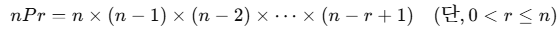 순열(Permutation): n개 중에서 r개를 순서를 고려하여 나열하는 방법의 수